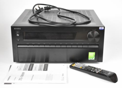 Onkyo TX-NR809 AV Receiver with remote control, user manual and power cable.