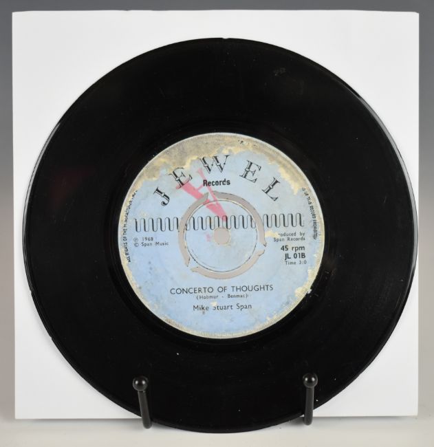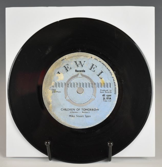 Mike Stuart Span Children Of Tomorrow b/w Concerto of Thoughts (Jewel JL 01) UK first press Psychedelic / Freakbeat 7" single from 1968. Matrix / deadwax JL 01 A and JL 01 B. Vinyl appears G+ possibly VG-, water damage on label.