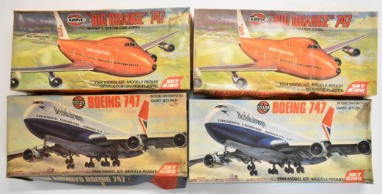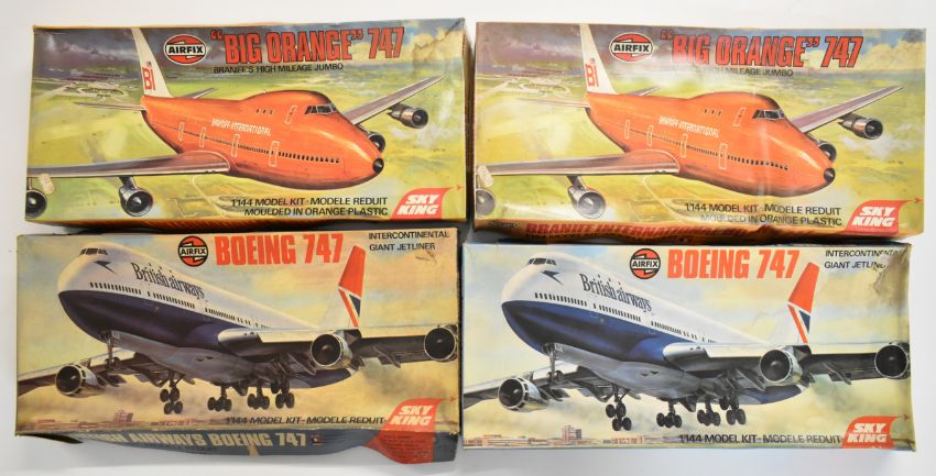 Four Airfix 1:144 scale plastic model Boeing 747 aeroplane kits comprising British Airways 08170-2 (x2) and Braniff International 08173-1, in original boxes with the contents in sealed bags.