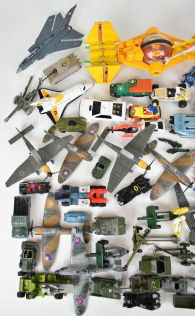 A collection of diecast model cars and military vehicles by Dinky, Corgi, Britains, Matchbox etc, to include Batmobile, Spectrum Patrol Car, Stargard, James Bond Lotus Esprit, Moonraker Shuttle, Penguinmobile and Shado 2.