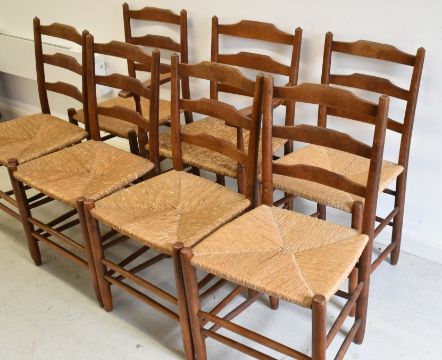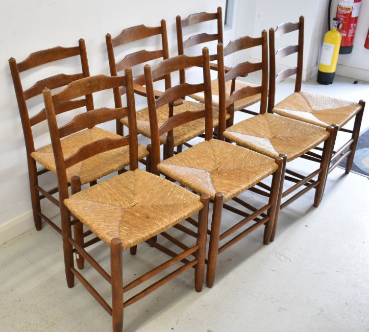 Set of seven (6+1) Arts & Crafts oak rush seated dining chairs