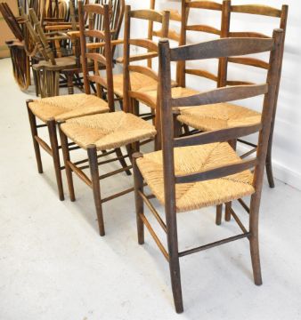 Set of six (5+1) Arts & Crafts oak rush seated dining chairs