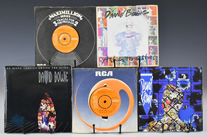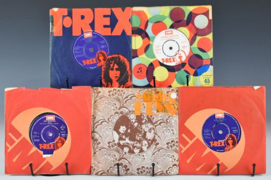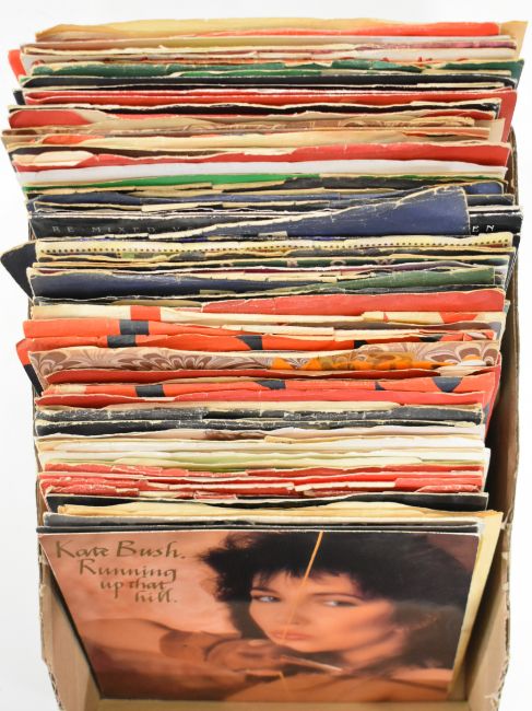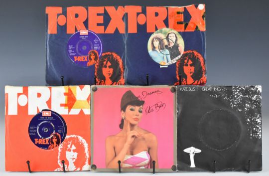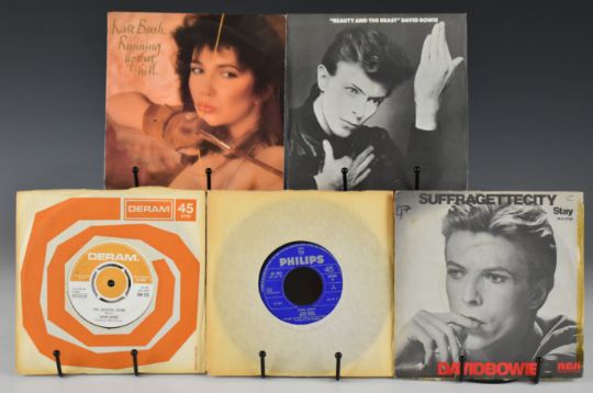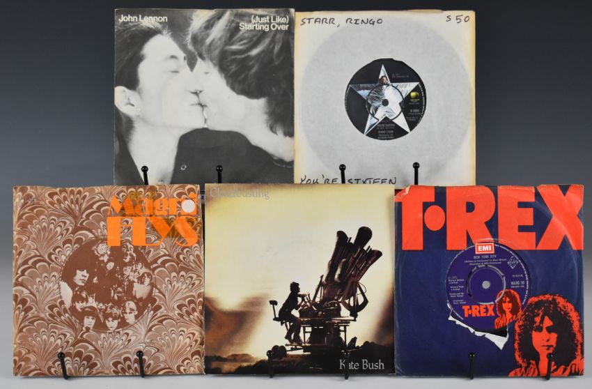 Over seventy 7" singles comprising twenty David Bowie plus two David Bowie flexi discs, fourteen Queen, eleven T Rex, five Kate Bush, eight Rolling Stones, three Beatles, two George Harrison, four Ringo Starr and six John Lennon. Vinyl appears VG+ in the main.