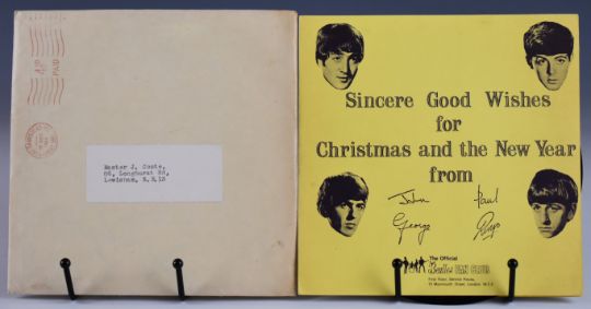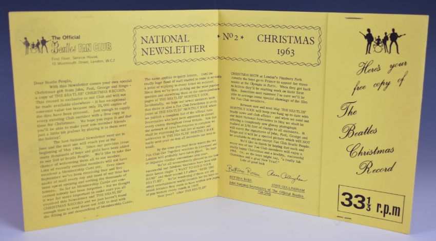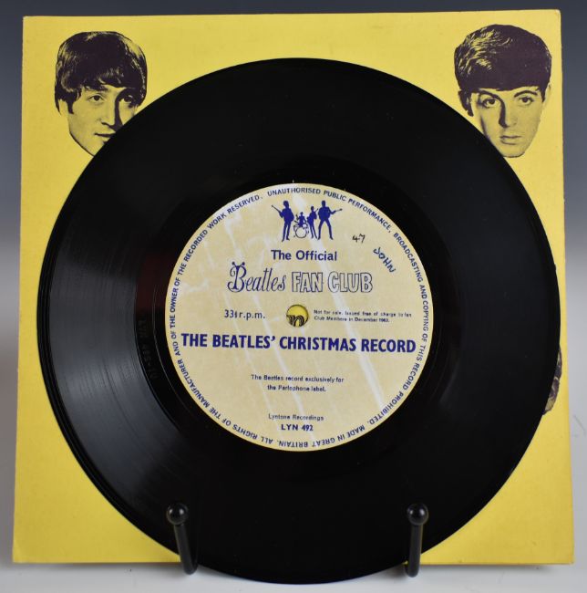 The Beatles' Christmas Record, single sided flexi disc only sent to The Official Beatles Fan Club members. The gatefold sleeve opens to provide the Fan Club's National Newsletter No 2 Christmas 1963. The flexi-disc has the number 47 and name JOHN in biro. The matrix / runout is LYN 492-1U. The original mailing envelope is included and is postmarked 18th December 1964